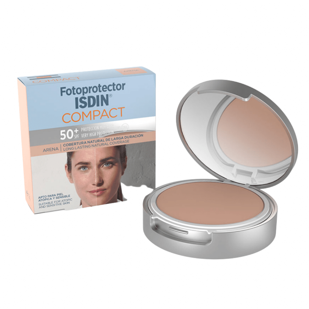 Maquillaje compacto con protector solar, en color arena adaptable a cualquier tono. Muy alta protección UVB/UVA SPF50+ HE-VL IR-A. Fotoprotector ISDIN Compact Arena SPF 50+. Protege y matifica en un único gesto. Proporciona la sensación de confort ideal para la piel mixta y grasa. Apto para piel atópica y piel sensible. Unifica el.