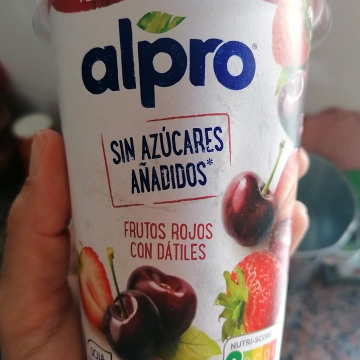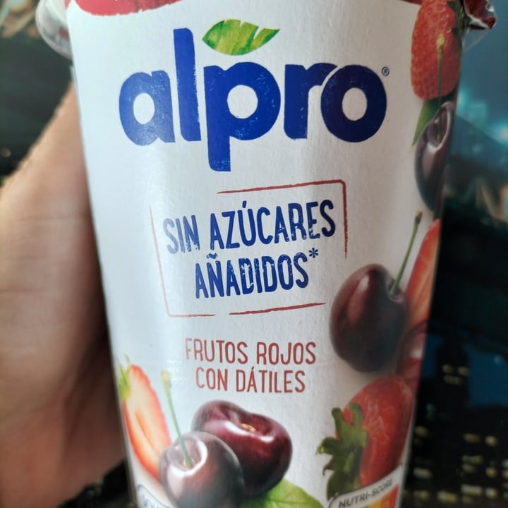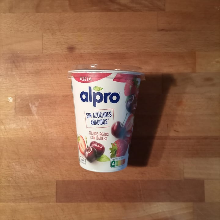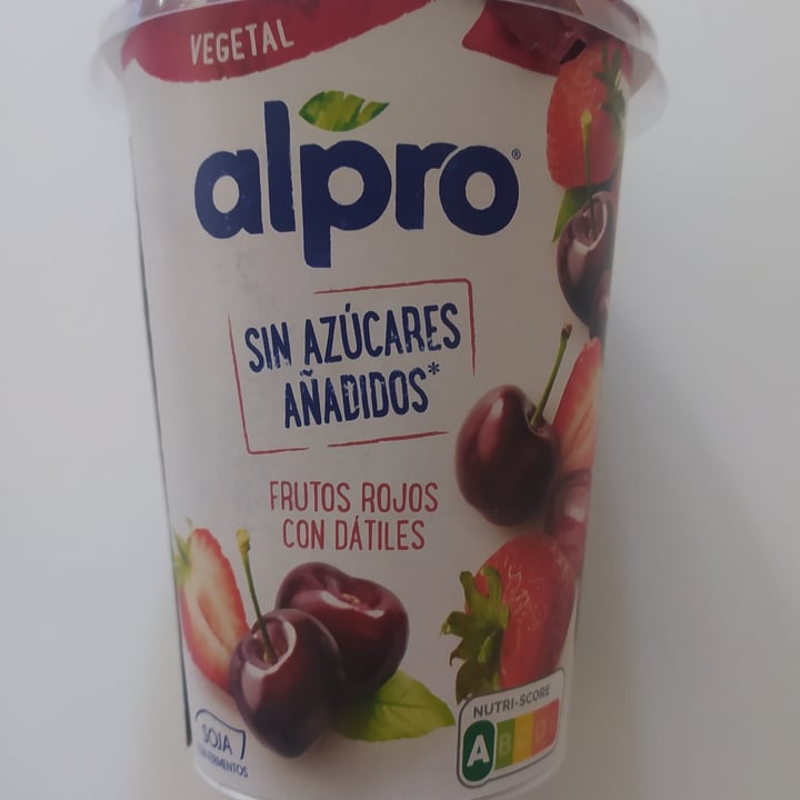 Alpro Frutos rojos con dátiles. Producto fermentado a base de soja, fresa, cereza y dátil, con calcio y vitaminas añadidas. Encuentra tu oferta. La fruta de este Alpro es tan naturalmente dulce que no le hemos añadido ni una pizca de azúcares ni edulcorantes. Porque un sabor así, ¡no necesita azúcares añadidos!