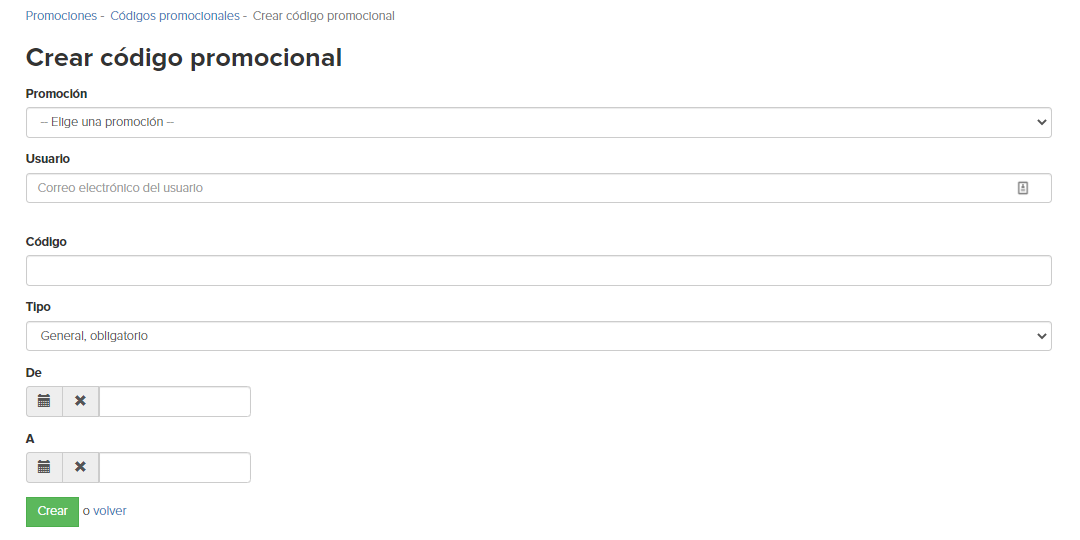El código de promoción es una combinación simbólica que otorga un descuento fijo para un producto/oferta específico o un grupo de productos/ofertas. Para crear un código de promoción, vaya a «Ventas» — «Promociones» — «Códigos de promoción» — haga clic en el botón «Crear código de promoción». Luego, complete los campos.