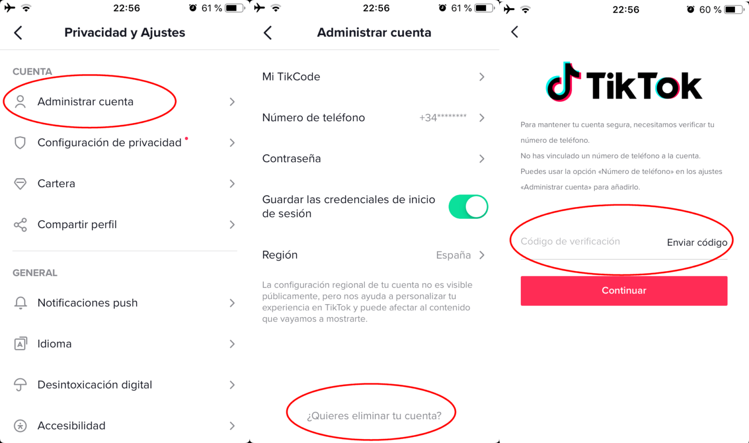 3. Selecciona "Administrar cuenta". 4. Selecciona "Eliminar cuenta". 5. Si estás decidido a eliminar la cuenta, pulsa "Continuar". 6. Verifica tu cuenta para poder finalizar el proceso de eliminación y después pulsa "Eliminar cuenta". Importante: Después de borrar tu cuenta de TikTok, no podrás acceder a tus vídeos.