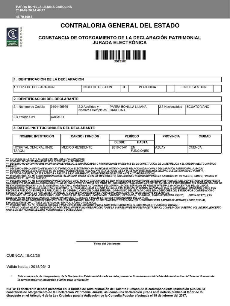 UCEDTIC Contraloría General del Estado, Declaración Juramentada de