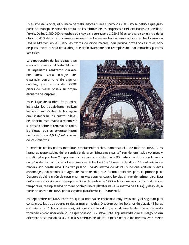 Arquitectura, estructura, construcción, estilo e historia de la Torre Eiffel. Con motivo de la Exposición Universal de 1889, fecha que marcaba el centenario de la Revolución Francesa, se publicó un gran concurso en 1886. Las primeras excavaciones se realizaron el día 26 enero 1887. El día 31 marzo 1889 finalizó la construcción de la.