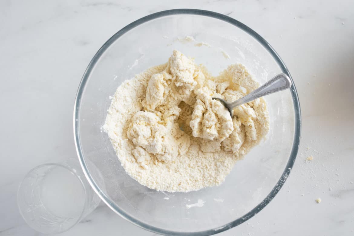 Rub the butter and flour together with your fingertips until it resembles breadcrumbs. Alternatively, use a pastry cutter to help start the process and then finish with your fingertips. Add 3 tbsp of water and mix with a butterknife to bring everything together. If necessary, add more water one tbsp at a time.