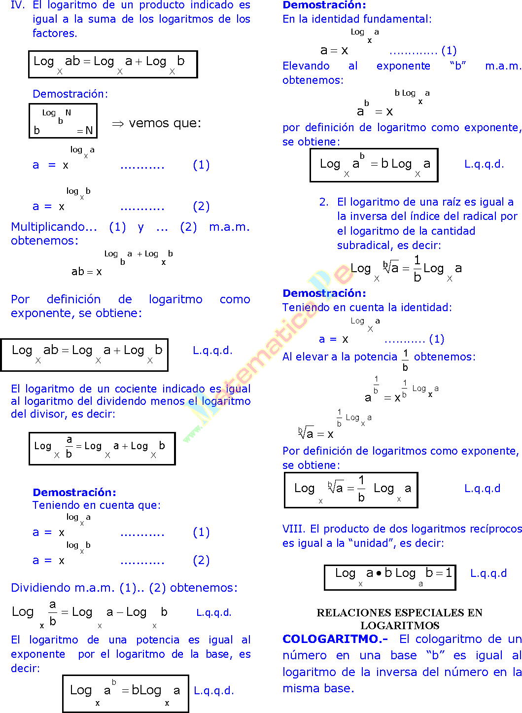 En esta página proporcionamos una colección de ecuaciones logarítmicas y sistemas resueltos. En la mayoría de los logaritmos no se especifica la base porque presuponemos que es 10. Además, al final de la página demostramos las propiedades de los logaritmos: logaritmo del producto, del cociente, de la potencia y el cambio de base.