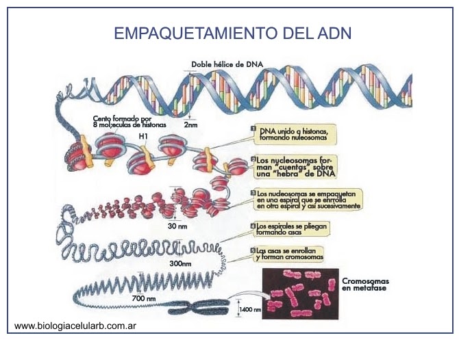Empaquetamiento del ADN. El ADN de las células eucariotas tiene una longitud enorme, de modo que hay que empaquetarlo bien para que sea manejable (figura 1). El ADN se enrolla alrededor de ocho proteínas llamadas histonas, constituyendo unidades en forma de cuentas denominadas nucleosomas. Los nucleosomas forman una especie de hebra llamada.