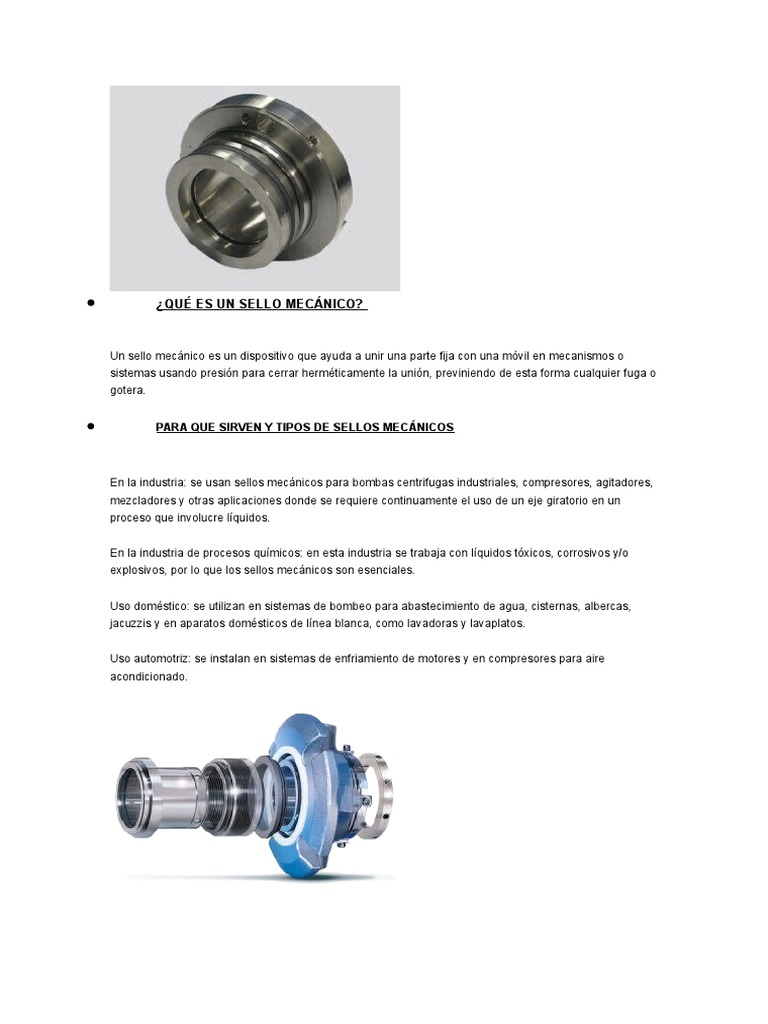 Los sellos mecánicos para bombas son elementos cuya finalidad es separar dos ambientes, entre los que no debe existir comunicación de fluidos.. El término sello mecánico designa precisamente un sistema de contención de fluidos dentro de un depósito en el que un eje giratorio pasa a través de una carcasa fija o en el que el depósito gira alrededor del eje.