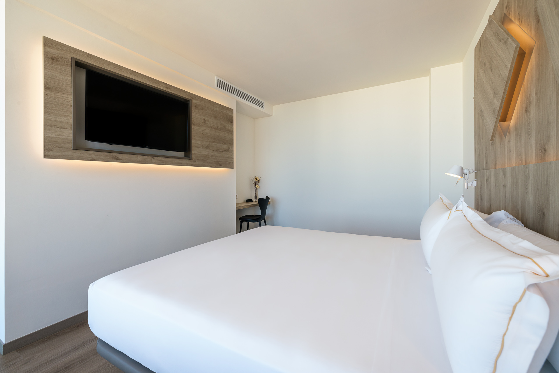 Max. 3 people. 25m2. 1 double bed (180cm) Bright, spacious and functional, these are our Double Rooms. Designed with an open concept and using warm tones, these rooms will give you a feeling of tranquillity and comfort as soon as you enter them. They have a 1.80x2 m bed and a bathroom with a rain shower integrated in the room.