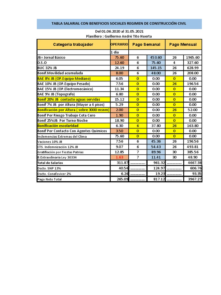 Tabla Salarial Con Beneficios Sociales Regimen de Construcción Civil