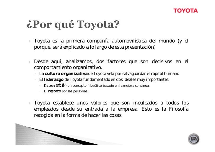 Toyota es una de las compañías fabricantes de automóviles más grandes del mundo y sobre todo, la más respetada por su calidad. La sede principal se encuentra en Toyota City, Aichi, Japón y el inicio de sus operaciones, tuvo lugar en 1937, generando una filosofía, un sistema de producción y un conjunto de principios guía que son admirados y estudiados por académicos y empresarios.